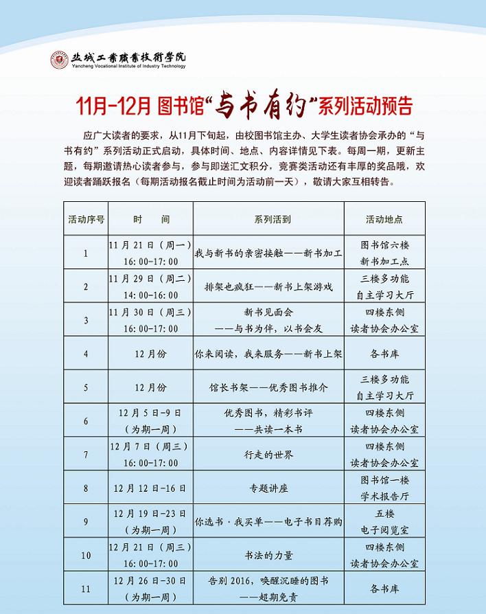 11月-12月 盐工院图书馆“我与书有约”系列活动预告