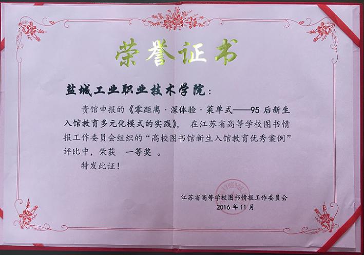 近日,江苏省高等学校图书馆读者服务与队伍建设发展论坛在南京理工大学、南京农业大学举行。在本次会议上,对江苏省高校新生入馆教育优秀案例获奖单位进行了表彰颁奖和大会交流。我校申报的《零距离•深体验•菜单式——95后新生入馆教育多元化模式的实践》,在江苏省图书情报工作委员会组织的“高校图书馆新生入馆教育优秀案例”评比中荣获一等奖,是全省唯一获得该奖项的高职高专院校。