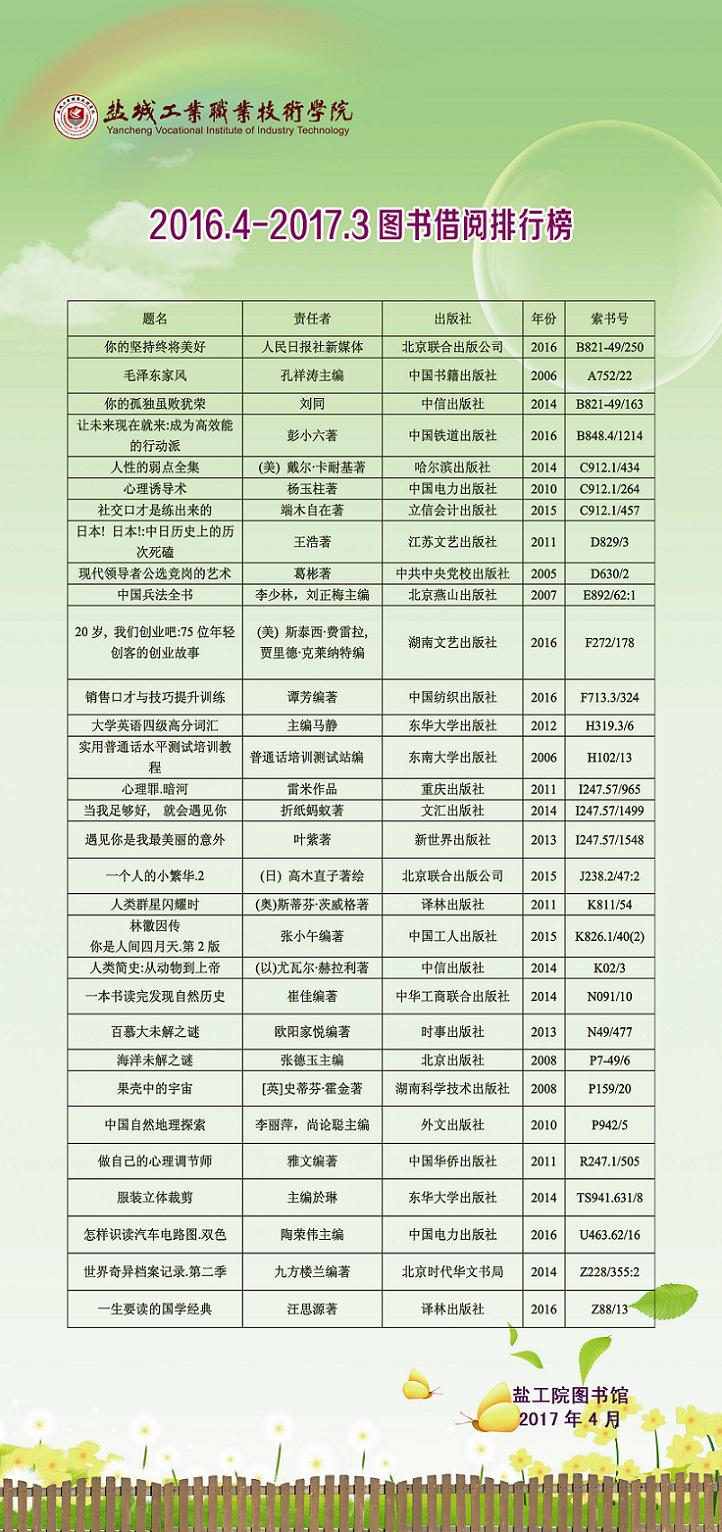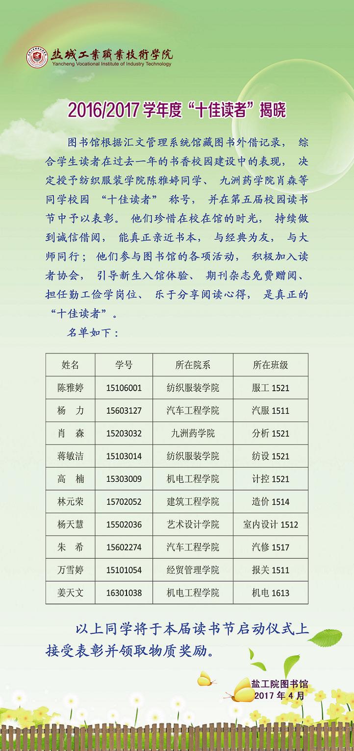 2016/2017学年度“十佳读者”揭晓及图书借阅排行榜