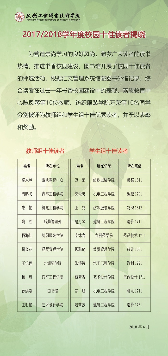 为营造崇尚学习的良好风尚,激发广大读者的读书热情,推进书香校园建设,图书馆开展了校园十佳读者的评选活动,根据汇文管理系统馆藏图书外借记录,综合读者在过去一年书香校园建设中的表现,素质教育中心陈凤琴等10位教师、纺织服装学院万荣等10名同学分别被评为教师组和学生组十佳优秀读者,并予以表彰和奖励。