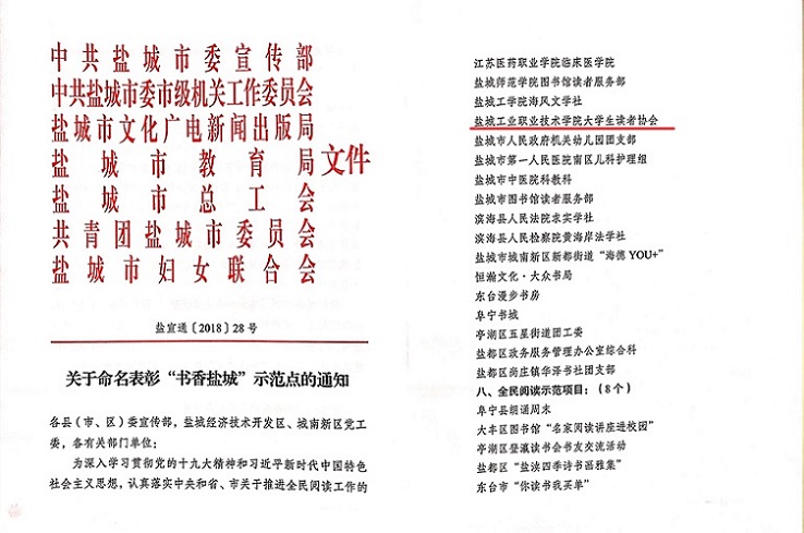 近日,由盐城市委宣传部、共青团盐城市委、市文化广电新闻出版局等部门联合开展的2018年“书香盐城”示范点建设评比活动结束,我校大学生读者协会荣获盐城市“青年书香号示范点”荣誉称号,全市共20家单位获表彰。